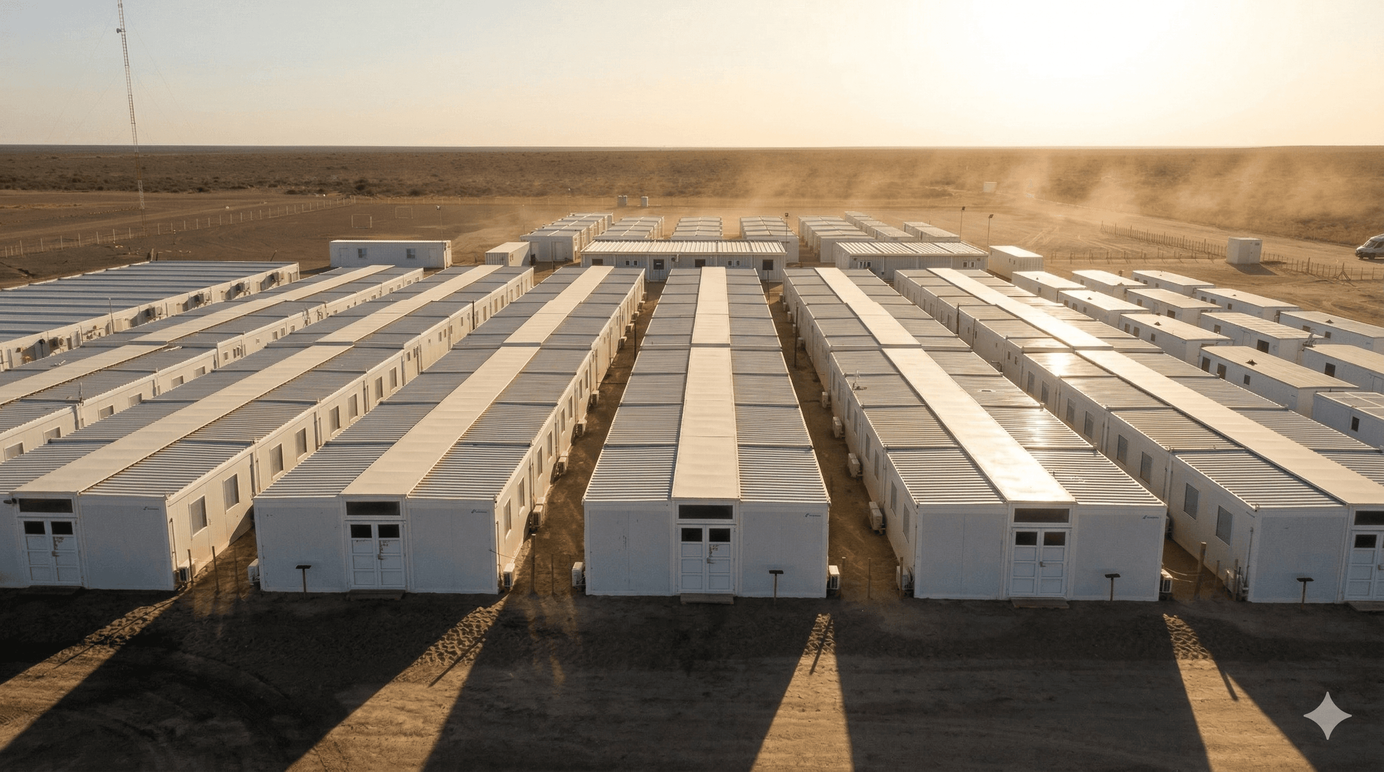 Módulos habitacionales, oficinas, comedores, espacios comunes y unidades sanitarias.